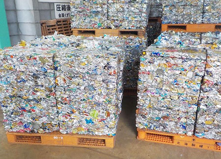 ビン・缶選別再生処理設備には、破袋補助コンベアー、選別コンベアー、磁力選別機、スチール缶圧縮機、アルミ缶圧縮機等で構成され、ビンは色別カレット化、缶はプレス加工化しています。